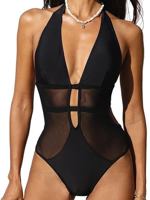 THE ALLURE, REDEFINED- Sleek black fabric hugs curves with a mesh patchwork design that teases the skin in all the right places. The plunging V-neckline boosts confidence, while strategic cutouts blend boldness with sophistication—perfect for poolside glam or beachside allure.